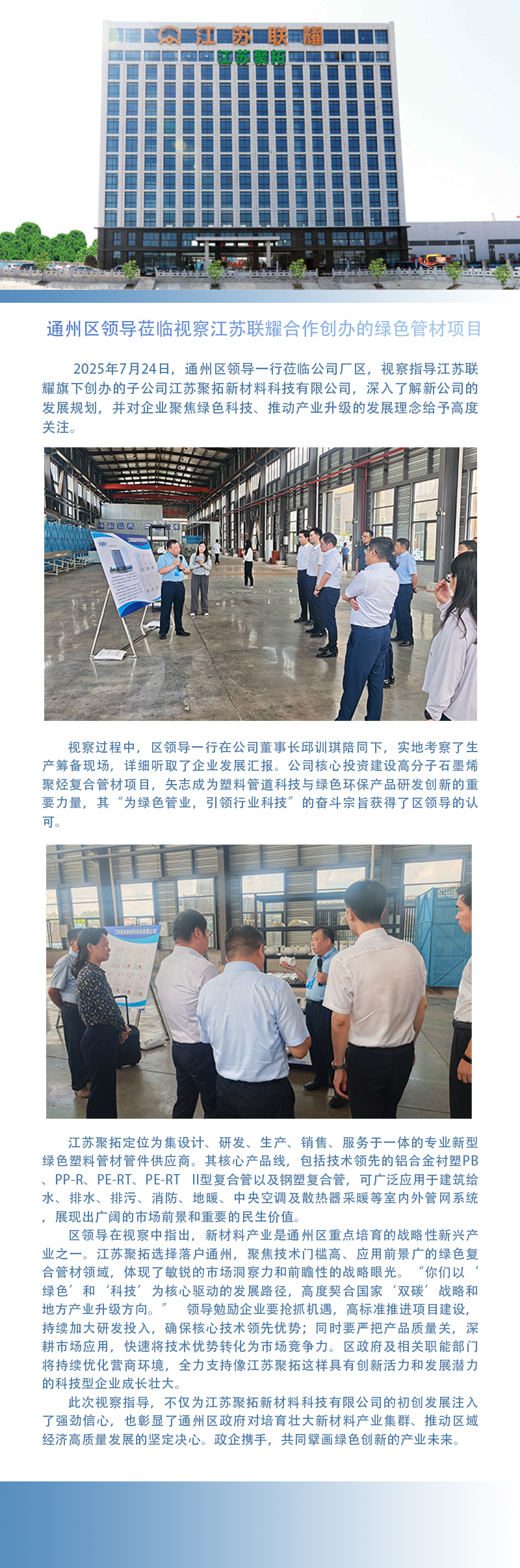 通州区领导莅临视察江苏联耀合作创办的绿色管材项目